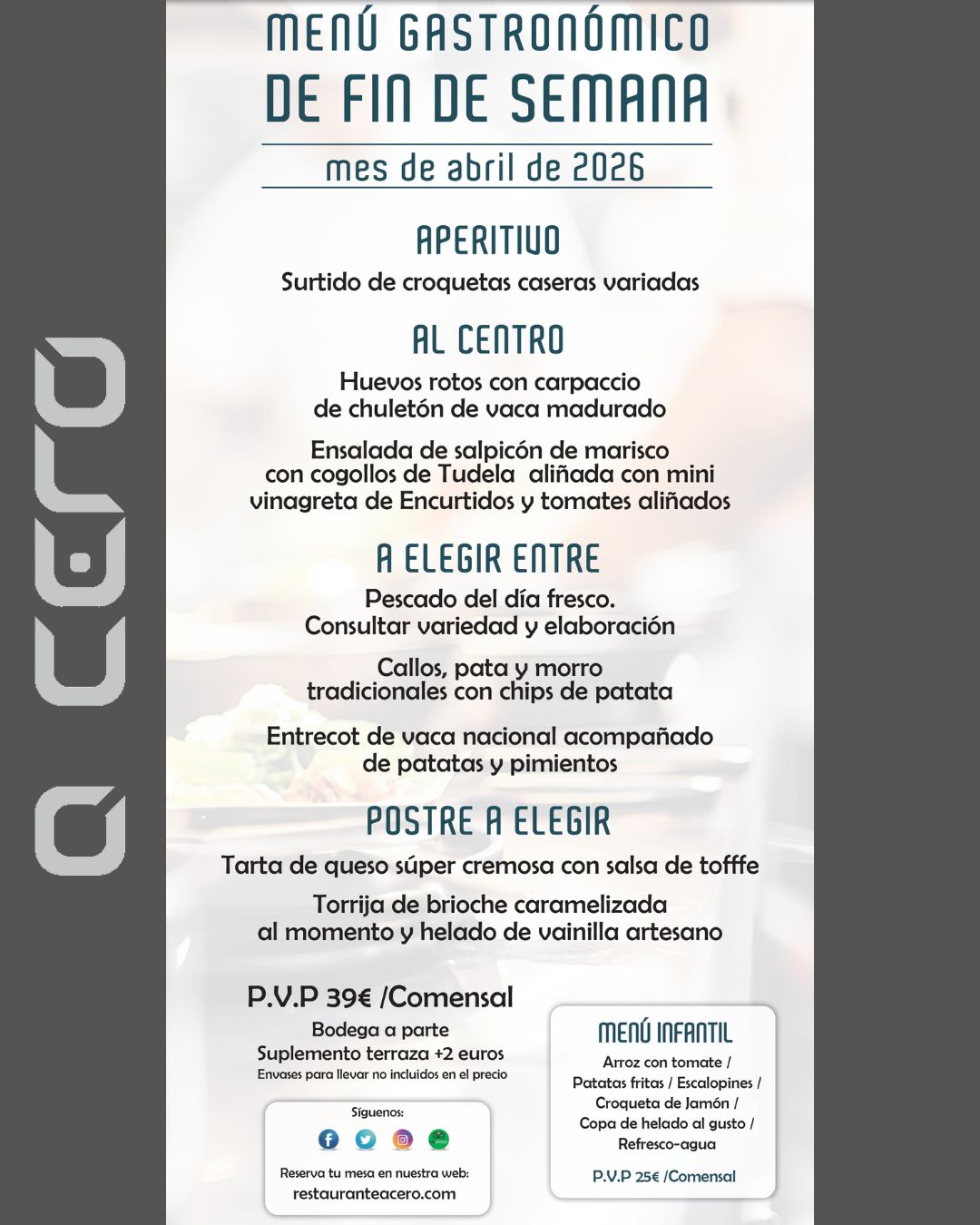 ¡Los fines de semana en Acero son sinónimo de sabores excepcionales y momentos inolvidables! Te presentamos nuestros exclusivos Menús de Fin de Semana, cuidadosamente elaborados para ofrecerte una experiencia gastronómica única.